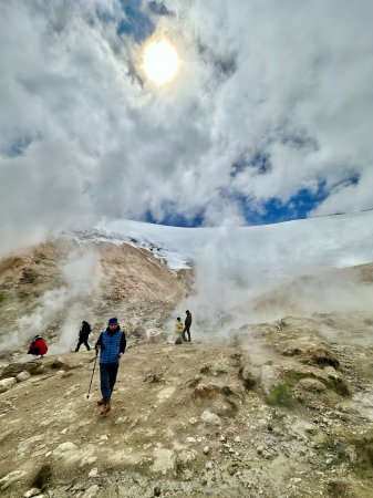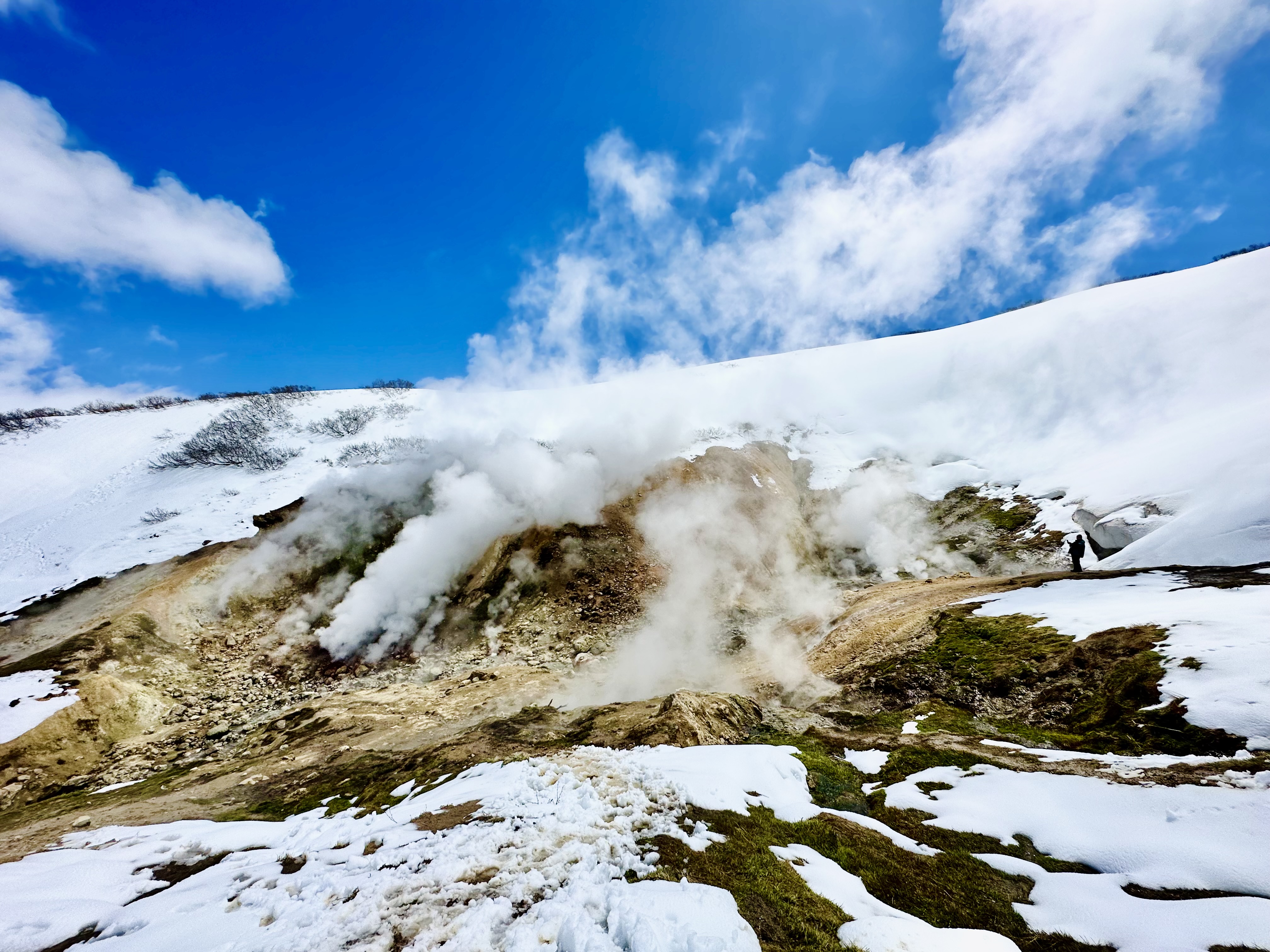 Дачные источники: Завершим наше приключение в уникальном месте – Дачных источниках. Здесь, в окружении заснеженных пейзажей, вы увидите удивительное явление: термальные воды, бурлящие прямо из под земли и горячий пар, который с шумом вырывается из трещин в земле, создают контраст с ледяными и заснеженными просторами. Это место, где стихии демонстрируют свою невероятную силу и красоту!